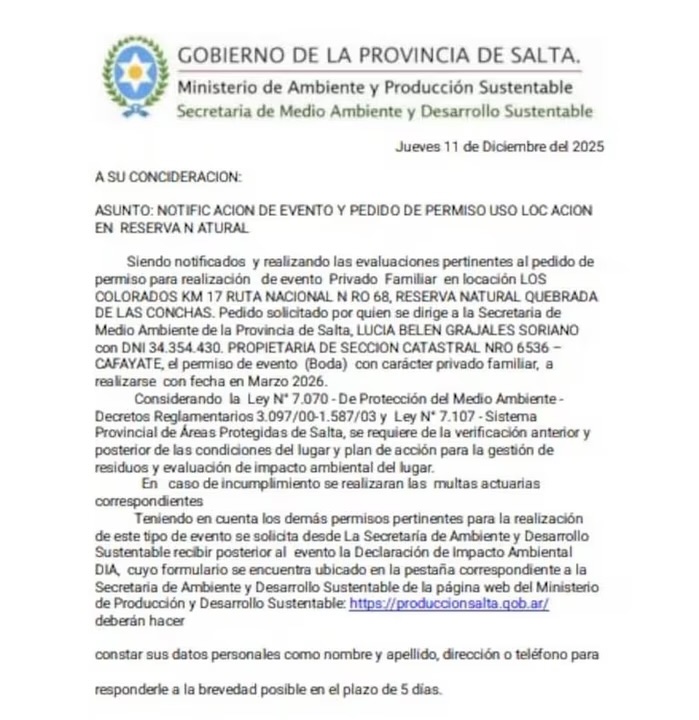 El escrito tiene fecha del 11 de diciembre de 2025 y membrete del Gobierno de Salta. En el texto se detalla un supuesto aval para celebrar la boda dentro de la reserva natural, sobre la Ruta Nacional 68. Pero apenas lo revisaron, saltaron las inconsistencias: palabras mal separadas, errores de tipeo y ortográficos y un formato que no coincide con los documentos habituales de la administración pública.