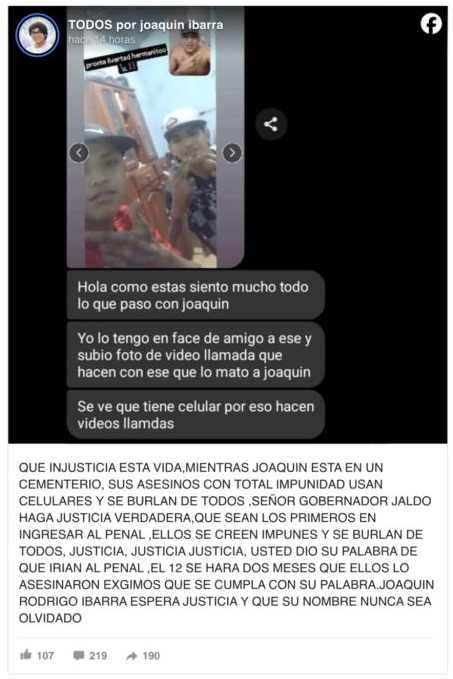 “Mientras Joaquín está en un cementerio, sus asesinos con total impunidad usan celulares y se burlan de todos”, expresaron en una publicación difundida en Facebook desde una cuenta que impulsa el pedido de justicia por el caso.