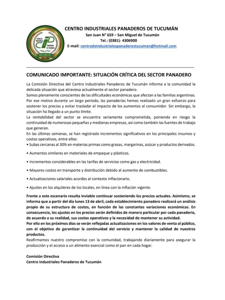 A través de un comunicado, la Comisión Directiva del Centro Industriales Panaderos de Tucumán informó sobre la situación que atraviesa actualmente el sector panadero y confirmó un nuevo incremento que regirá desde el lunes 13 de abril.