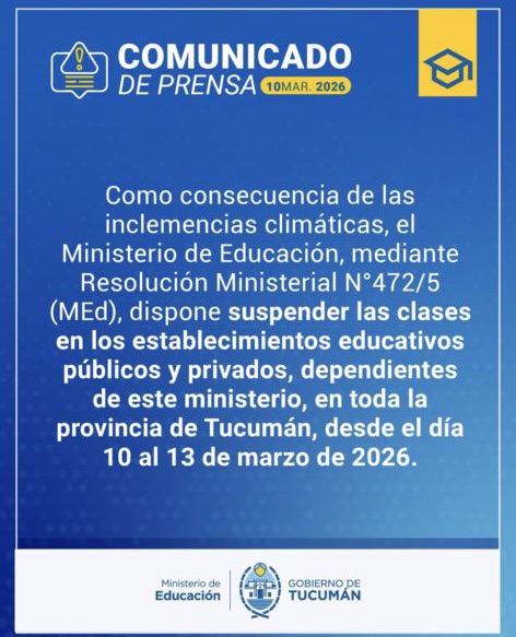 El Gobierno de Tucumán informó este martes que las clases quedaron suspendidas en todo el territorio provincial, incluido el Gran San Miguel de Tucumán, debido a las intensas lluvias que no dan tregua en la región.