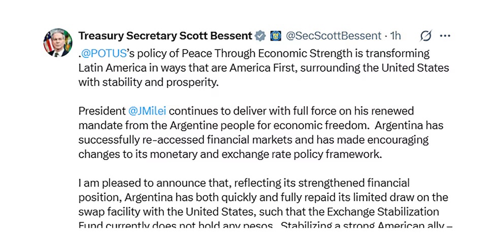 “Me complace anunciar que, como reflejo de su fortalecida posición financiera, la Argentina ha reembolsado rápida y completamente su limitada disposición del swap con Estados Unidos, de modo que el Fondo de Estabilización Cambiaria (ESF, por sus iniciales en inglés) actualmente no tiene pesos”, señaló Bessent.