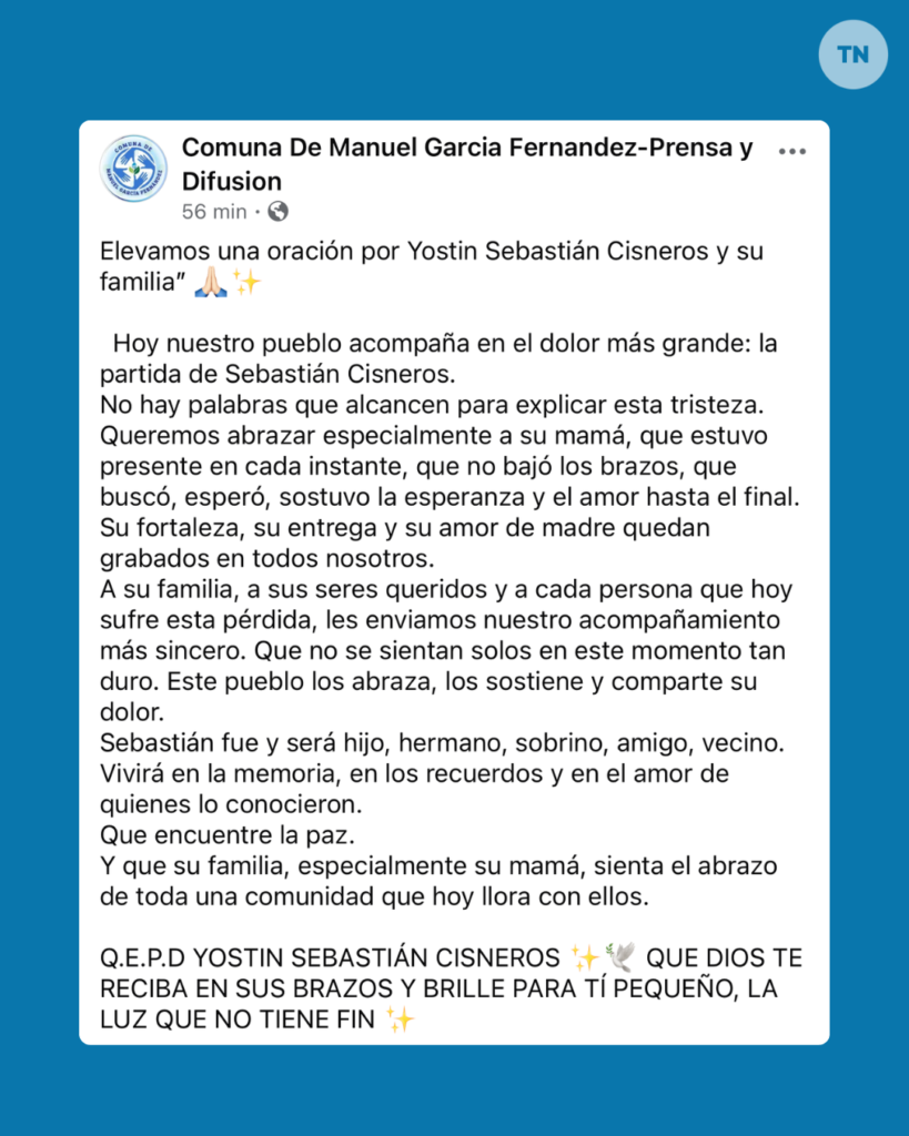 La Comuna de Manuel García Fernández difundió un sentido mensaje de despedida y acompañamiento tras el fallecimiento de Yostin Sebastián Cisneros.