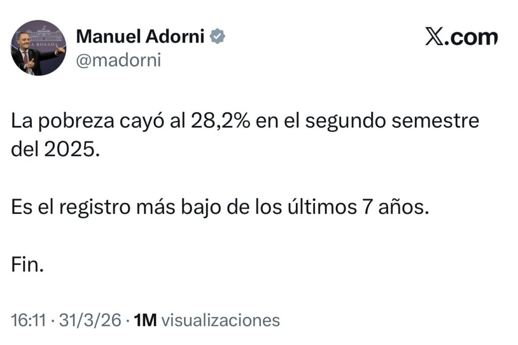 Tal vez no era lo más apropiado. Pero así fue. El INDEC informó que la pobreza había descendido al 28,2% en el último semestre de 2025 y, apenas un minuto después, el vocero Manuel Adorni lo celebró con una frase tajante: “Es la más baja en 7 años. Fin.”. No hubo matices, ni contexto, ni dudas. Solo una afirmación cerrada. En cuestión de minutos, el Gobierno de Javier Milei avanzó aún más: comparó ese número con el pico de 52,3% y construyó un mensaje político potente. Según esa lógica, la pobreza bajó 25 puntos y se sacó a 15 millones de argentinos de esa condición.