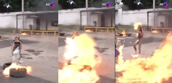 Según se ve en un video dado a conocer por un canal local, como forma de protesta los manifestantes iniciaron la quema de neumáticos en la entrada principal de la cárcel, lo que provocó que dos personas, un hombre y una mujer, se prendieran fuego al manipular las gomas encendidas. Las imágenes son impactantes y se ve cómo lograron apartarse a tiempo, aunque con parte de su ropa en llamas.