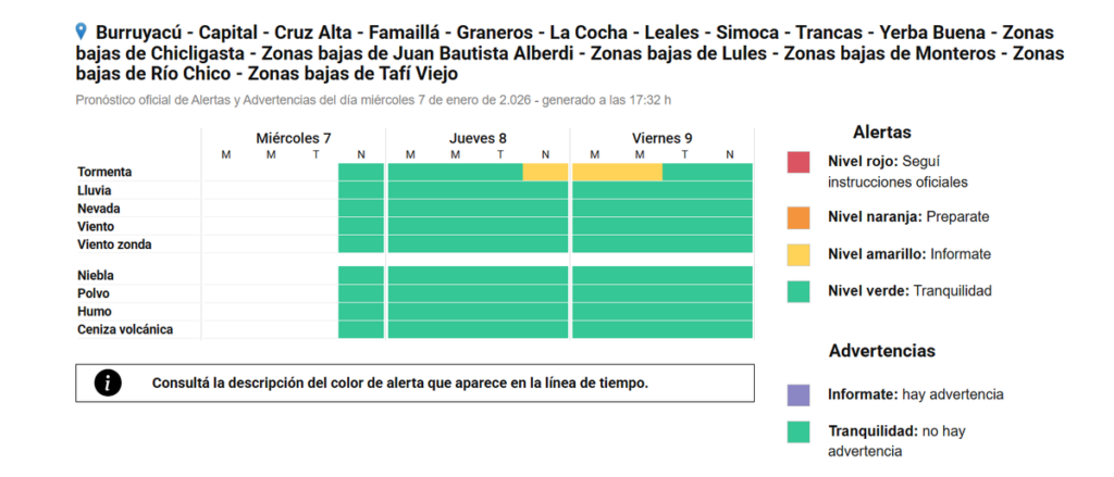 Además, informó que hay un alerta amarillo por tormentas fuertes para el jueves a la noche y se extendería durante la madrugada y la mañana del viernes.