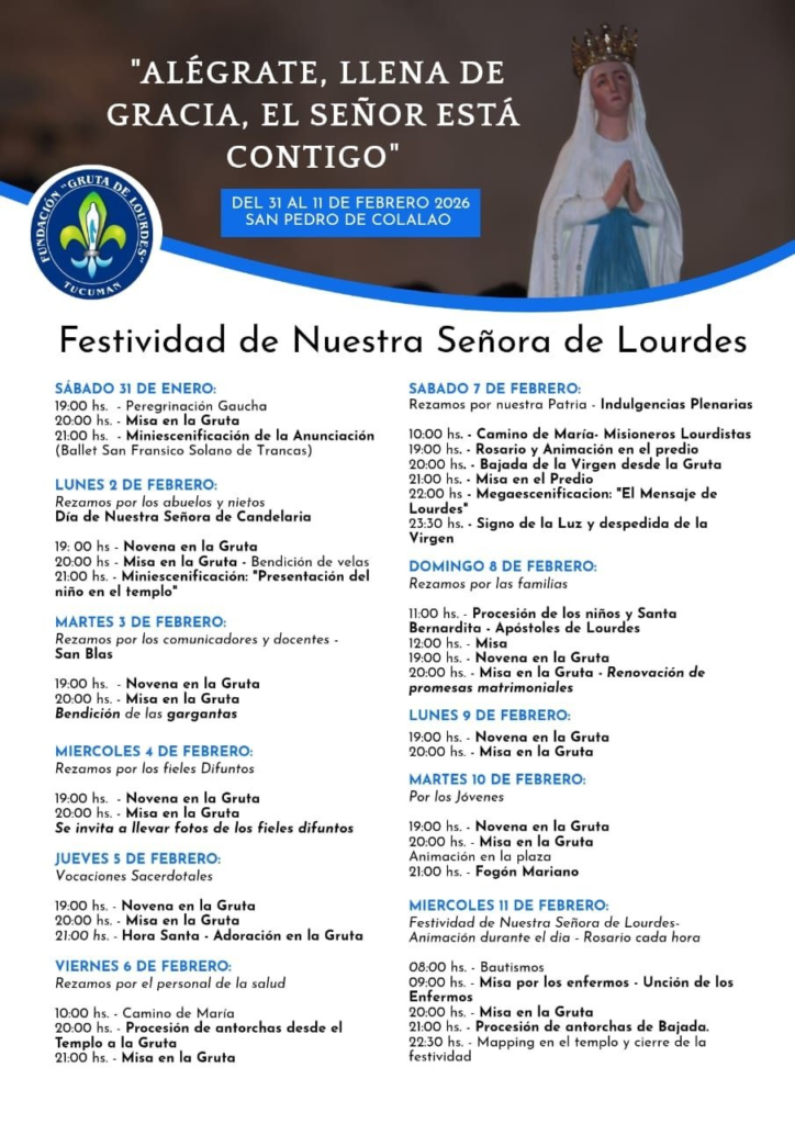 El programa se desarrolla en la Gruta de Lourdes y contempla jornadas de oración, novenas, misas temáticas, procesiones y actividades especiales, que culminarán el miércoles 11 de febrero, día central de la festividad.
