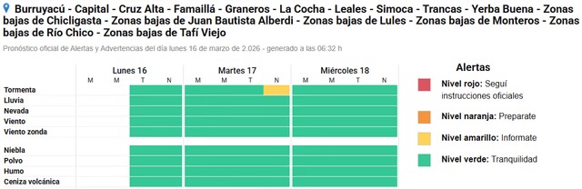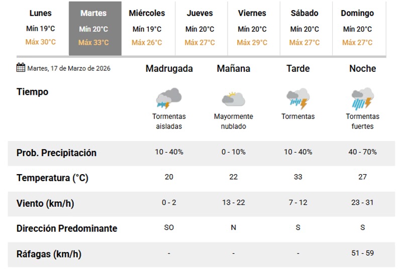 El área será afectada por tormentas de variada intensidad, algunas fuertes o puntualmente severas. Las mismas podrían estar acompañadas por actividad eléctrica frecuente, granizo, ráfagas de hasta 90 km/h y abundantes lluvias en cortos períodos. Se prevén valores de precipitación acumulada entre 25 y 50 mm, que pueden ser superados de manera local.