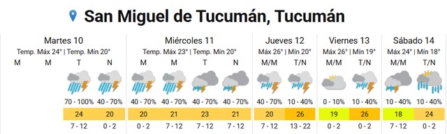 El área será afectada por tormentas, algunas fuertes. Las mismas podrían estar acompañadas por actividad eléctrica frecuente, granizo ocasional, ráfagas de hasta 70 km/h y, principalmente, abundantes lluvias en cortos períodos. Se prevén valores de precipitación acumulada entre 35 y 55 mm, que pueden ser superados de manera local.