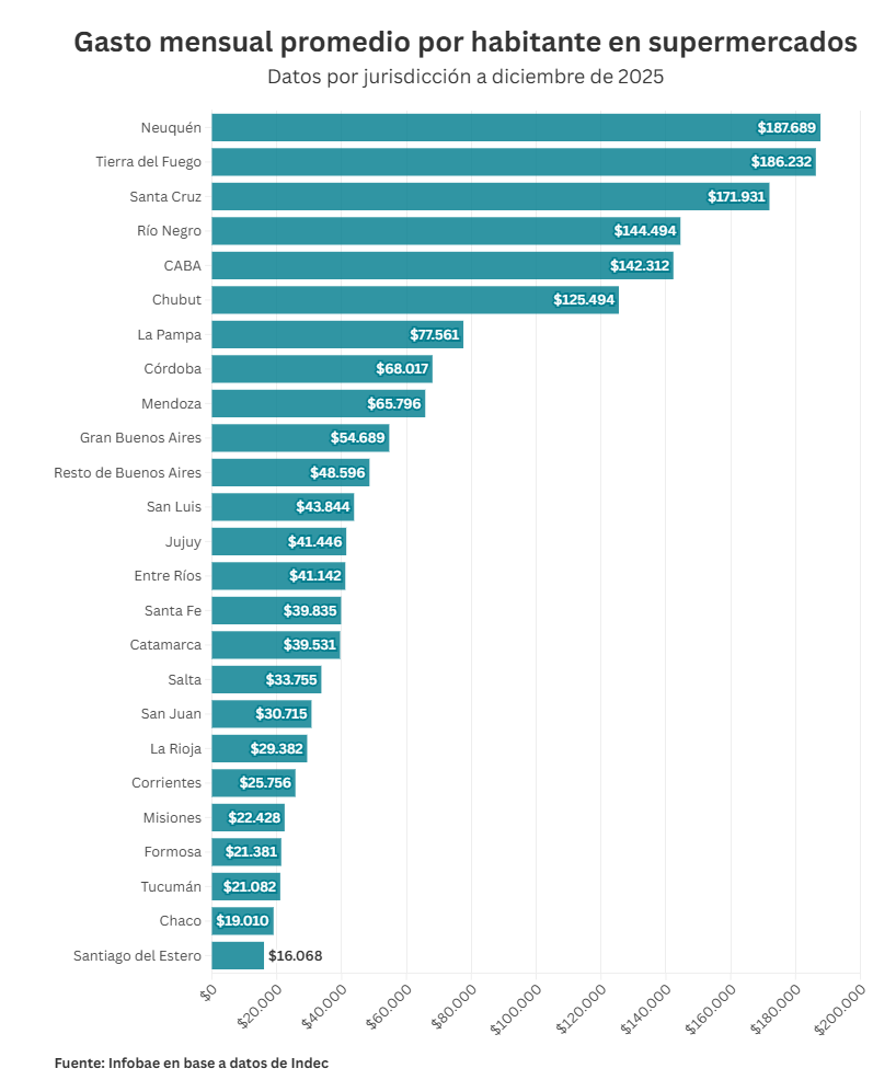 El análisis territorial permite identificar que las provincias de la Patagonia y la Ciudad Autónoma de Buenos Aires (CABA) encabezan los registros de mayor gasto en las góndolas. La provincia de Neuquén registró el valor más alto de todo el país, con una inversión promedio de $187.689 por habitante durante el último mes del año pasado. Le siguieron muy de cerca Tierra del Fuego, con $186.232, y Santa Cruz, con $171.931.