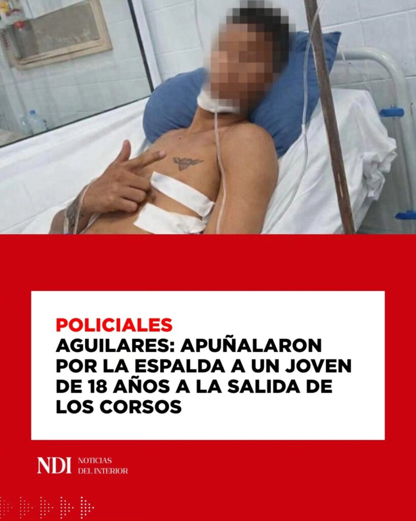 Un joven de 18 años resultó gravemente herido tras ser apuñalado por la espalda durante la madrugada de este sábado, luego de finalizar los corsos en Aguilares. El ataque ocurrió cuando la víctima se retiraba del lugar y es investigado por la Unidad Fiscal de Homicidios.